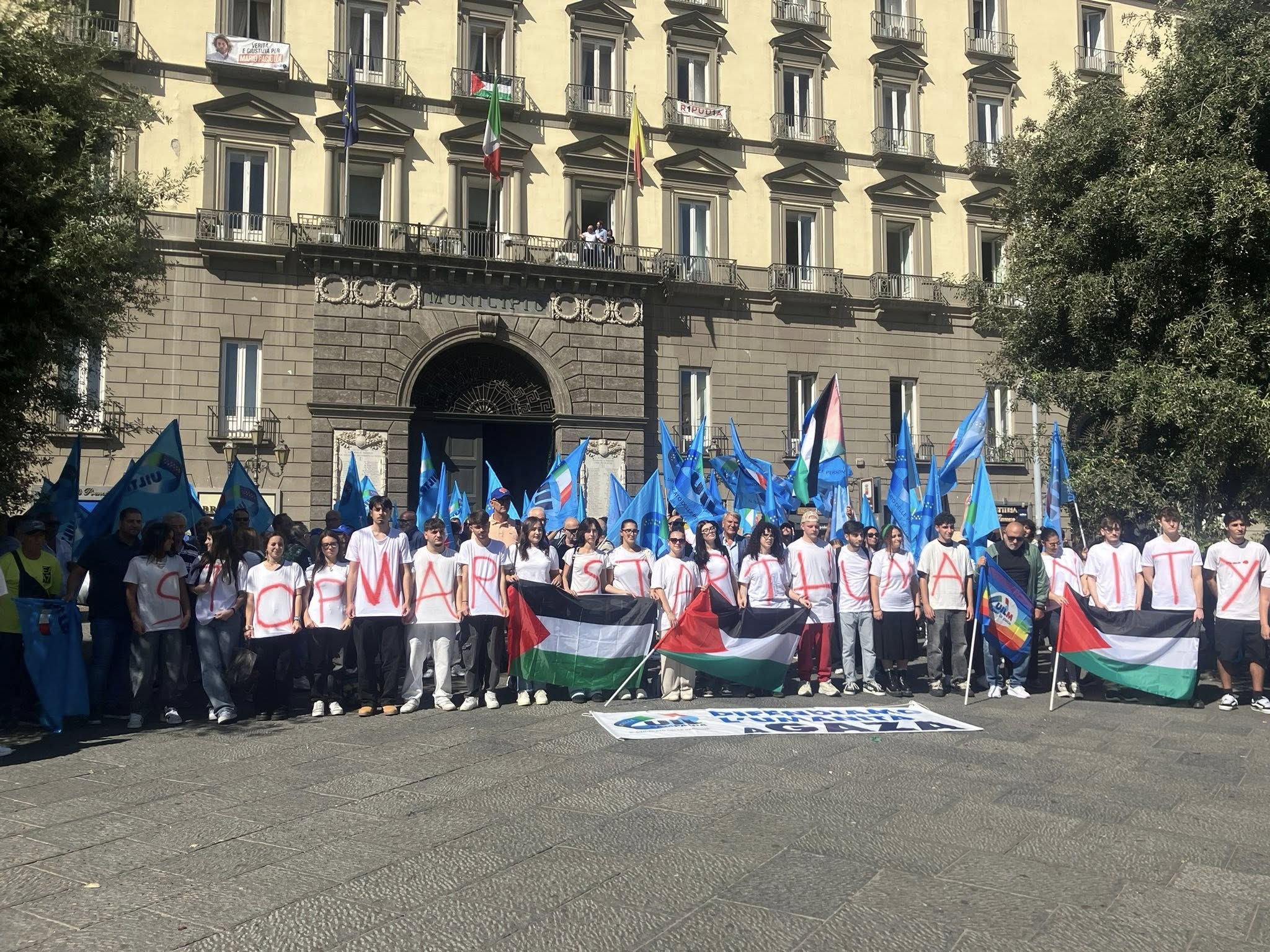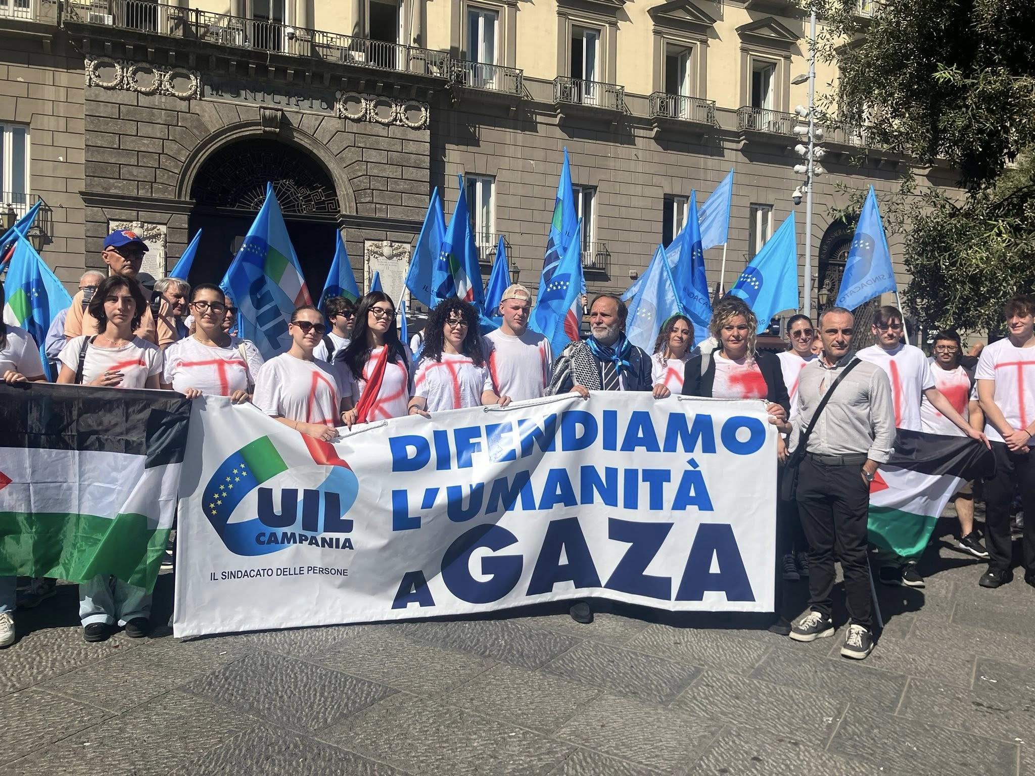 Le magliette bianche, simbolo di innocenza, macchiate di rosso per simboleggiare il sangue delle vite spezzate nella striscia di Gaza ed un solo grido di denuncia “difendiamo l’umanità a Gaza”: ha avuto inizio così il flash mob di questa mattina, in piazza Municipio, a Napoli, organizzato dalla UIL Campania, insieme alle categorie e tantissimi giovani, contro il massacro e a sostegno della pace a Gaza.