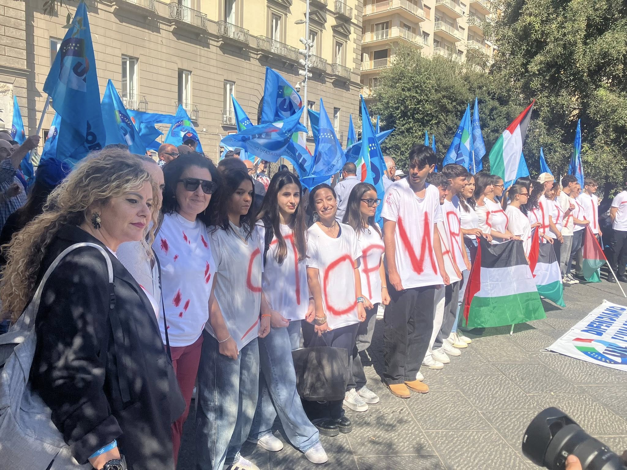 MAGLIETTE BIANCHE MACCHIATE DI ROSSO CONTRO LO STERMINIO A GAZA, LA UIL CAMPANIA ORGANIZZA UN FLASH MOB AL CENTRO DI NAPOLI.