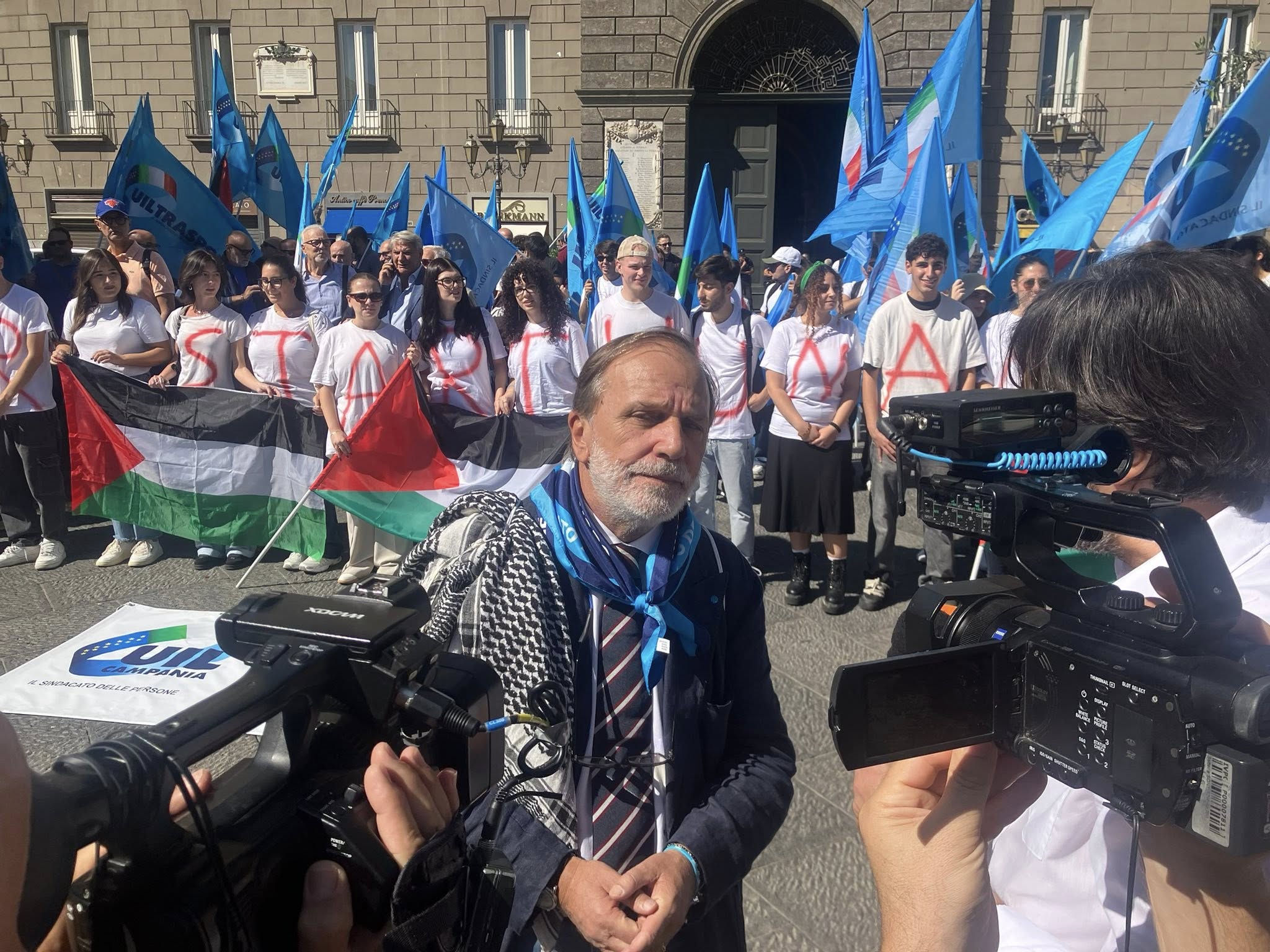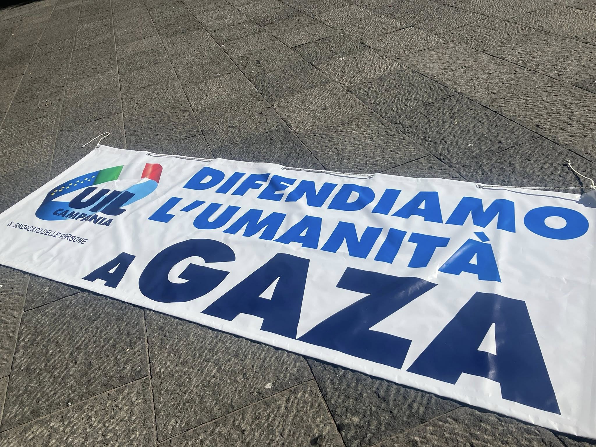 “Alla vigilia delle quattro giornate di Napoli, dalla nostra città, dalla UIL Campania, si alza un grido di pace e di libertà affinché si fermi il conflitto nella striscia di Gaza.” Così Giovanni Sgambati, segretario generale della UIL di Napoli e Campania, a margine del presidio.